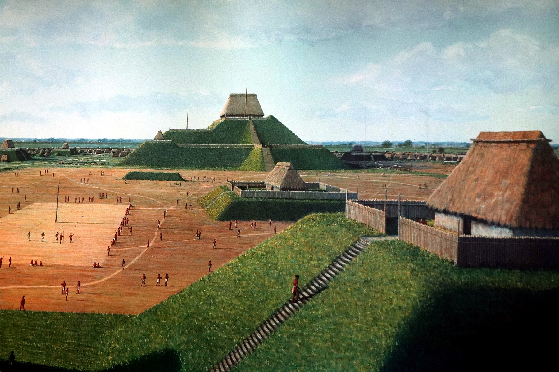 Hlavní náměstí představovalo centrum veřejného života Cahokie. Konaly se tu trhy i kulturní akce a lidé se zde věnovali také sportu. (ilustrace: Wikimedia Commons, CC BY 2.0)