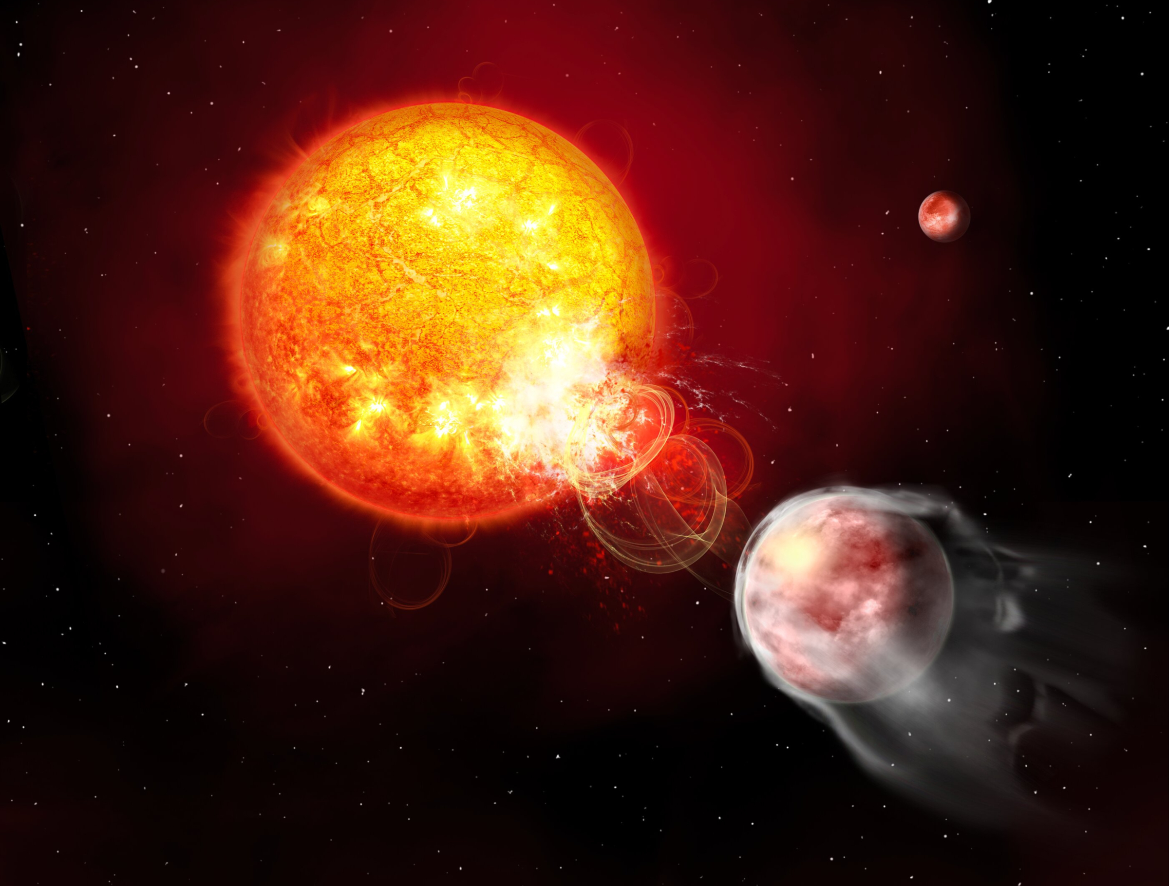 Exoplaneta HIP 67522 b obíhá velmi mladou hvězdu jednou za 7 dní a ovlivňuje její magnetické pole. Tím způsobuje mohutné erupce, které ji postupně trhají na kusy. (ilustrace: ESA, Leibniz Institute for Astrophysics Potsdam, Janine Fohlmeister, CC BY-SA 4.0)