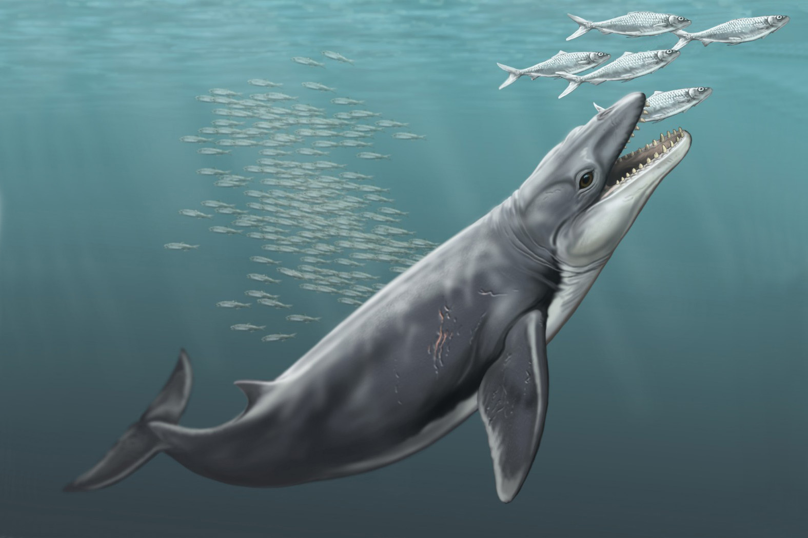 Zatímco jeho vzdálení příbuzní dnes dorůstají délek přes 30 metrů, Janjucetus dullardi měřil jen zhruba dva metry a byl hbitým lovcem. (ilustrace: Profimedia/Caters News)
