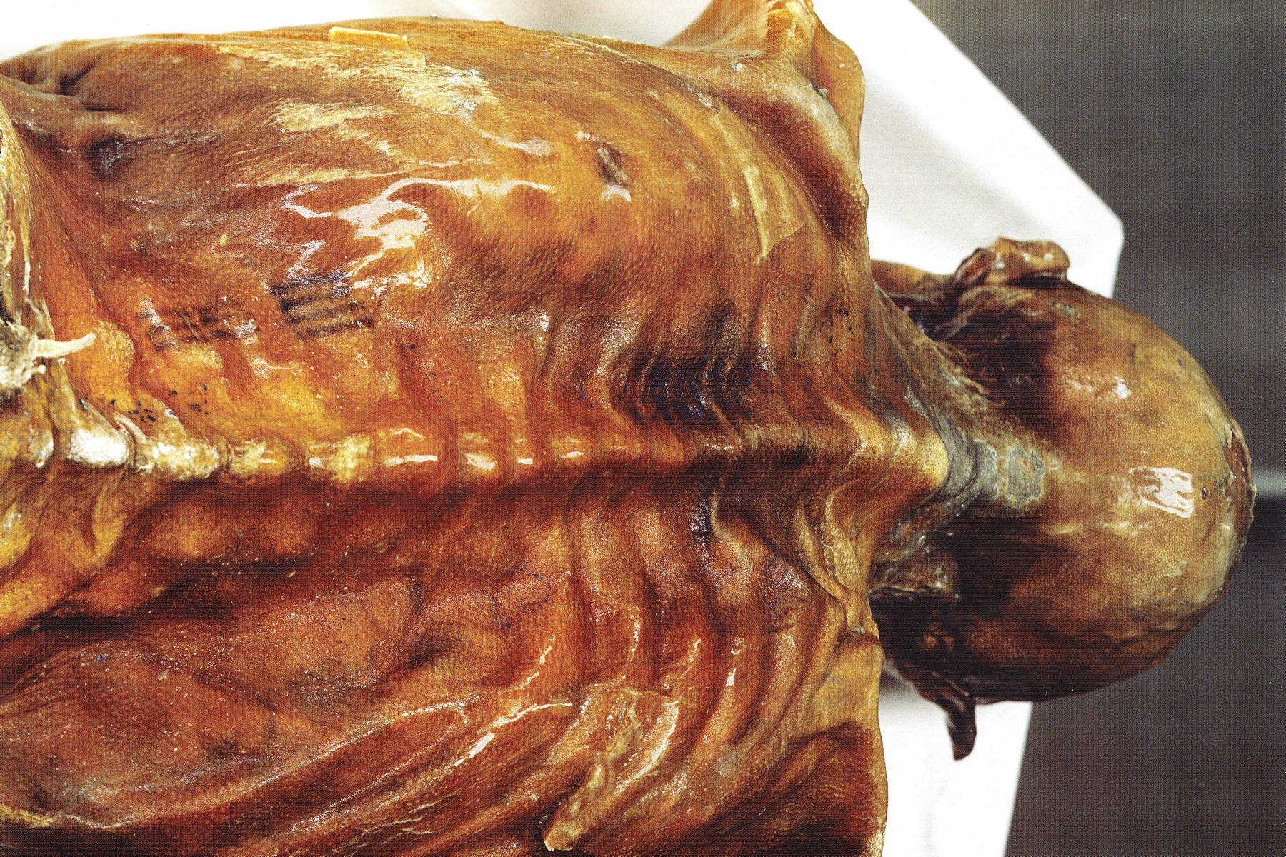 Shluky tetovaných čárek na zádech Ötziho.