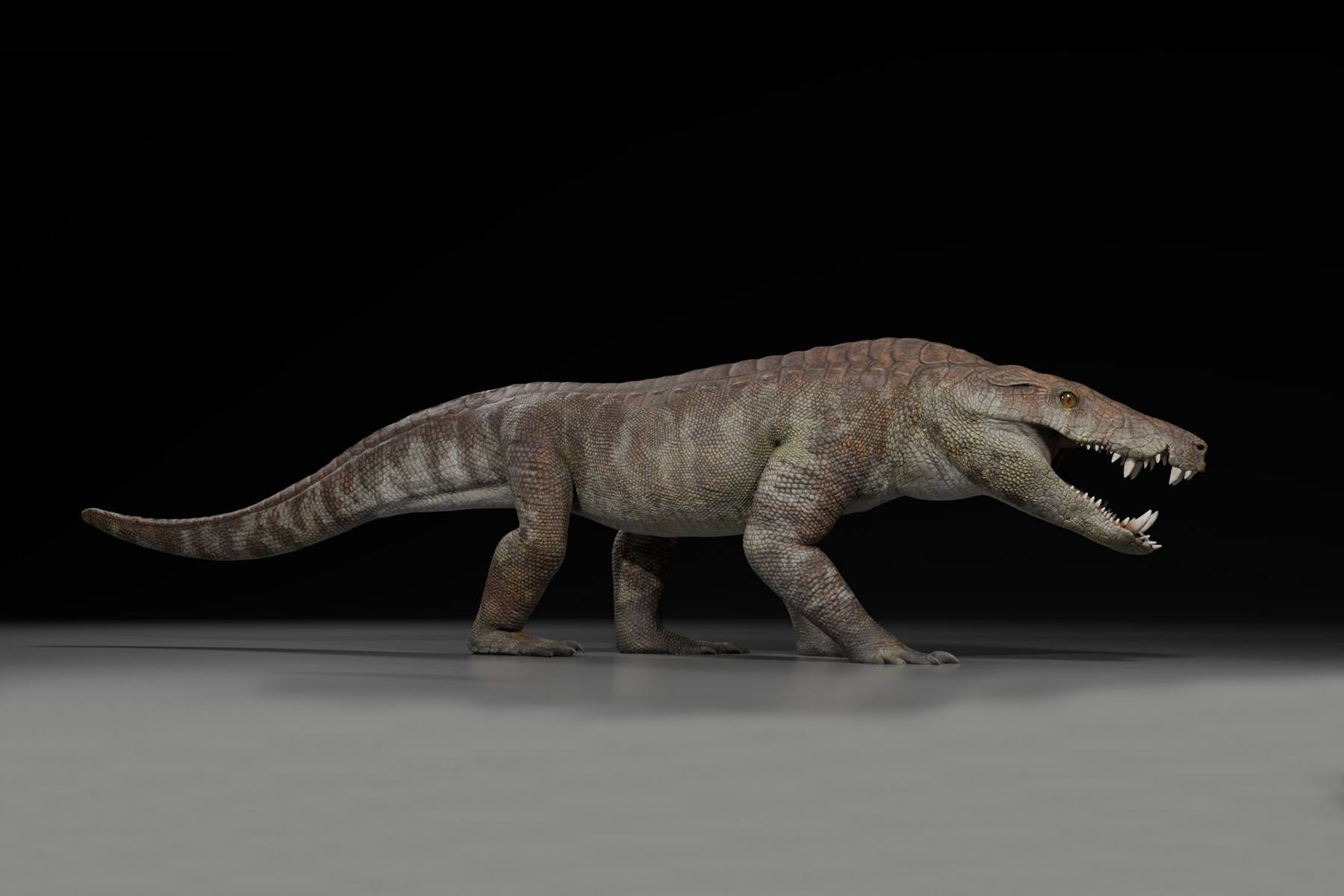 Čtvrttunový kostensuchus, podobný dnešním krokodýlům, byl nelítostným predátorem, k jehož kořisti patřili i dinosauři střední velikosti. (ilustrace: EurekAlert! Gabriel Diaz Yanten, CC-BY 4.0)