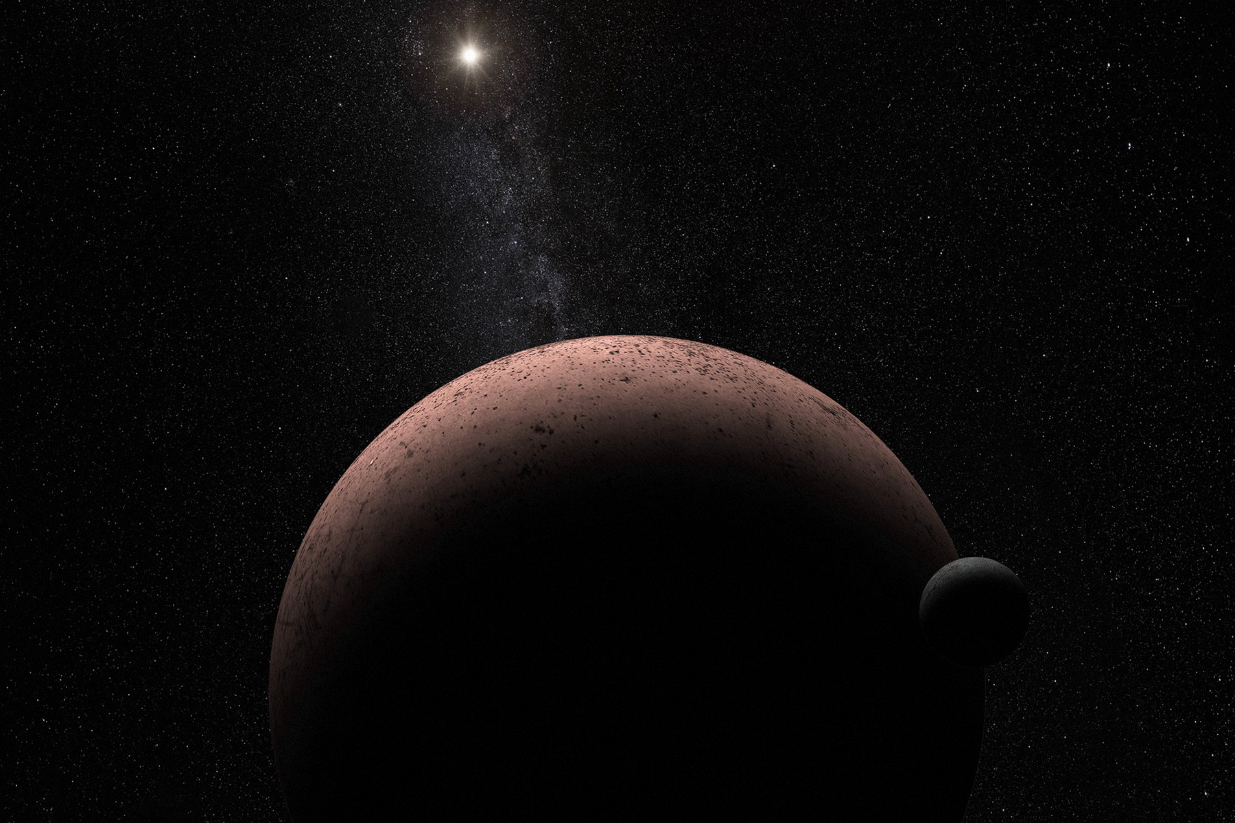 Vizualizace trpasličí planety Makemake a jejího měsíce. (ilustrace: NASA, ESA, A. Parker, CC BY-SA 4.0)