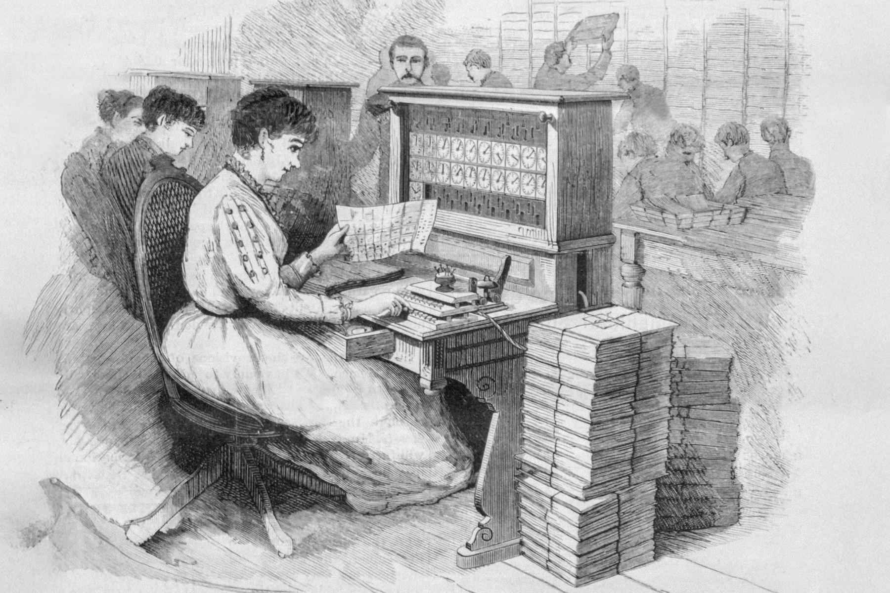 Zpracování dat ze sčítání lidu pomocí děrnoštítkového počítacího stroje systému Hollerith na ilustraci ze srpnového čísla amerického listu Scientific American z roku 1890. (ilustrace: Wikimedia Commons, PDM 1.0)