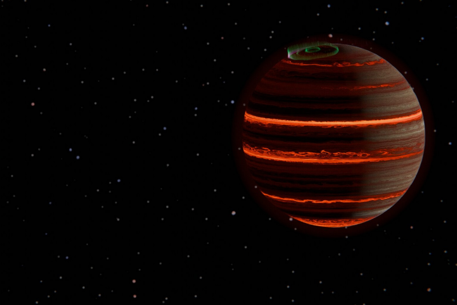 Díky detailním pozorováním Webbova dalekohledu víme, že na potulné exoplanetě SIMP-0136 jasně září mohutné polární záře. (ilustrace: Trinity College Dublin, Evert Nasedkin, CC BY-SA 4.0)