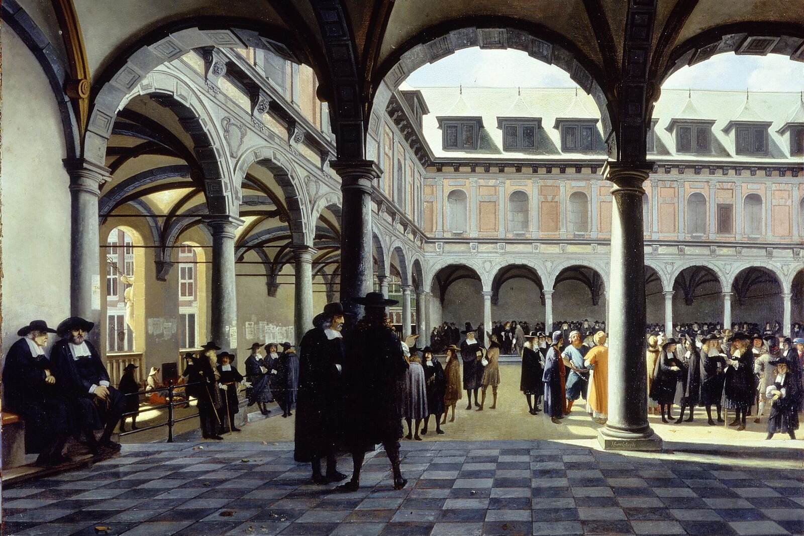 Obchodníci na nádvoří amsterdamské burzy na plátně ze 17. století. (ilustrace: Wikimedia Commons, Museum Boijmans Van Beuningen, PDM 1.0)