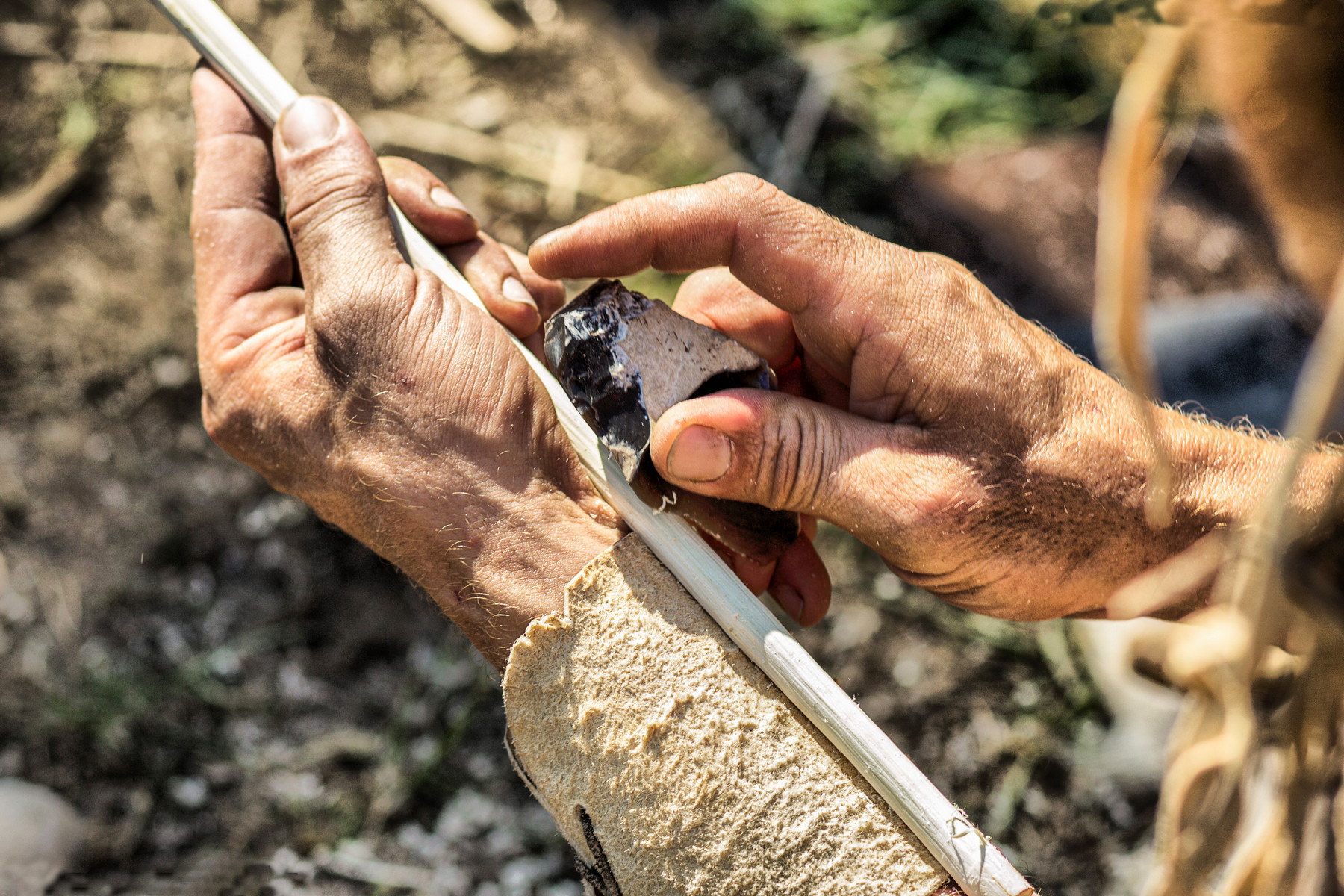 Výroba šípu pomocí kamenné čepele.