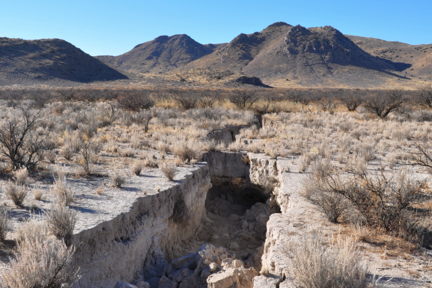 V arizonské Willcoxově pánvi se půda propadá rychleji než kdekoli jinde ve státě. Desítky let nekontrolovaného čerpání podzemní vody zde způsobily trvalý kolaps krajiny. (foto: Geological Society of America, Brian Conway, CC BY-SA 4.0)