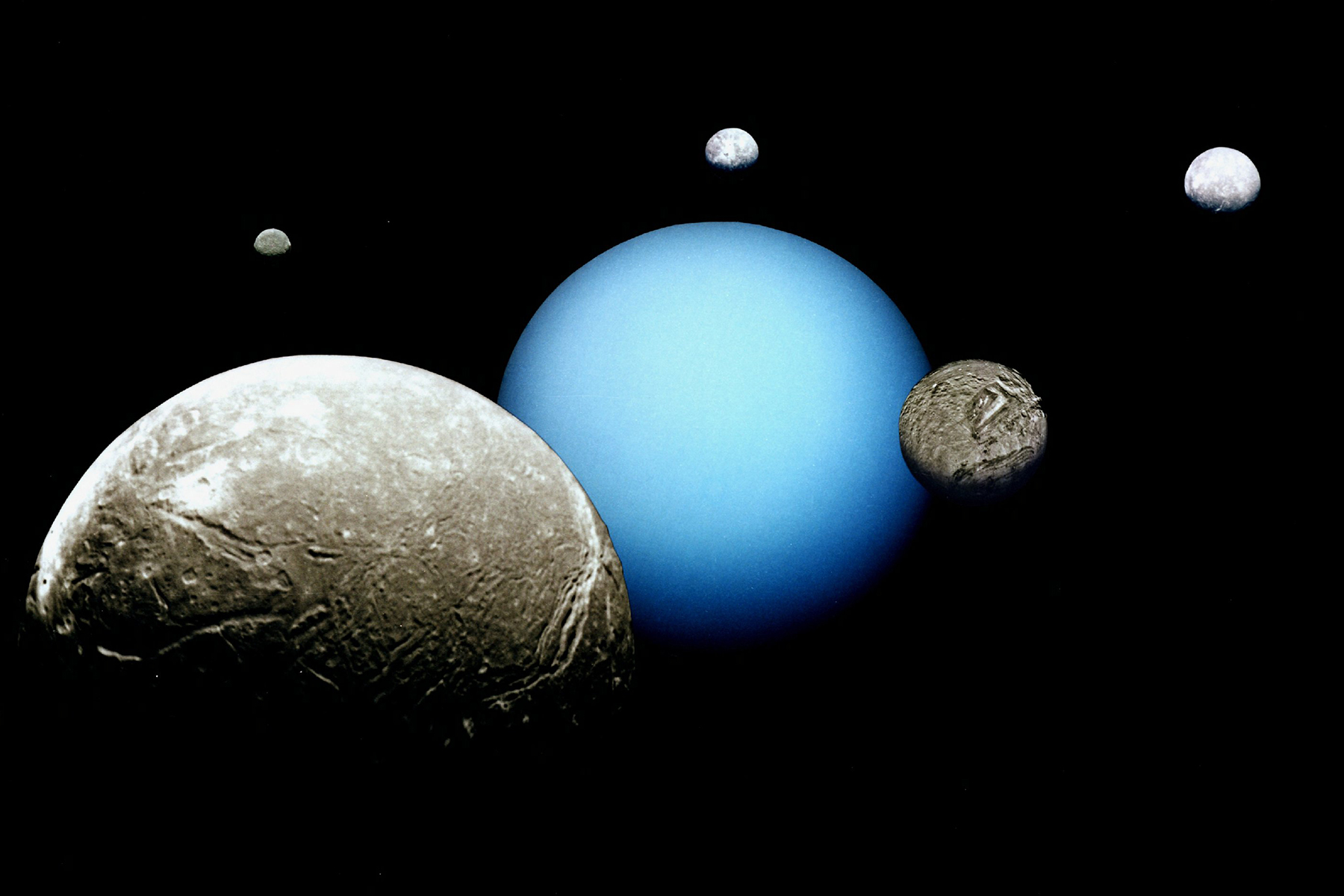 Povrch největších měsíců Uranu – Ariel, Miranda, Titania, Oberon a Umbriel, se výrazně liší od podmínek, jaké panují na menších vnitřních měsících. (foto: Wikimedia Commons, NASA/JPL, CC BY 4.0)