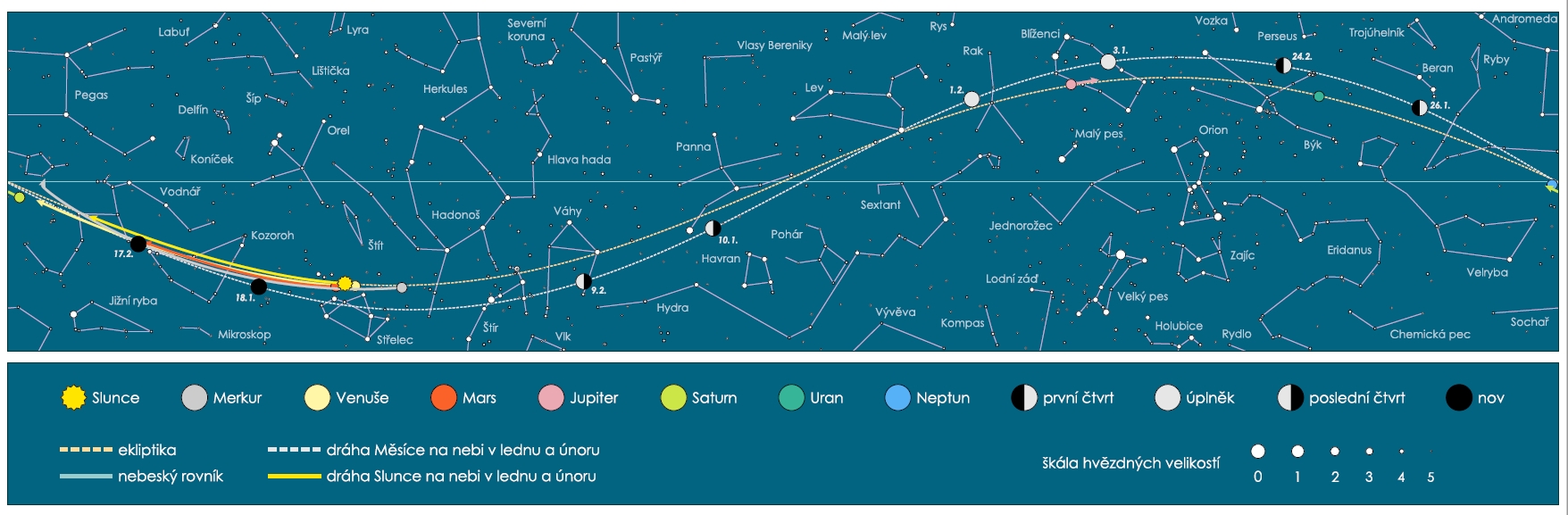 • Obdélníková mapa uvádí přibližné polohy významných těles Sluneční soustavy na lednové a únorové obloze. (zdroj: Jan Píšala - se souhlasem k publikování)