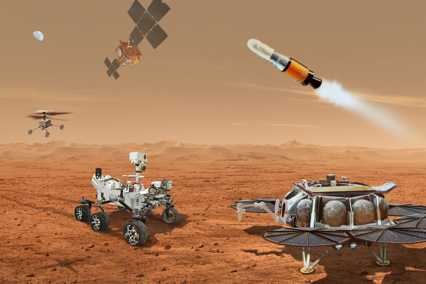 Americký Kongres omezil financování mise Mars Sample Return na tak nízkou částku, že to de facto znamená konec celého programu. Doprava vzorků z Marsu se odkládá na neurčito. (ilustrace: NASA/ESA/JPL-Caltech, CC BY-SA 4.0)