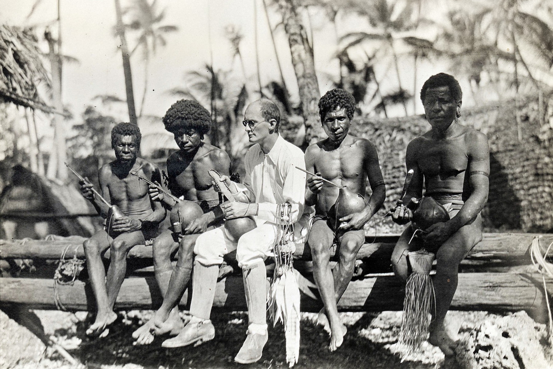 Bronisław Malinowski spolu s domorodci na Trobriandových ostrovech na fotografii z let 1917–1918. Směnný systém tohoto etnika je učebnicovým příkladem obchodního konceptu, který není založený na tržním principu. (foto: Wikimedia Commons, PDM 1.0)