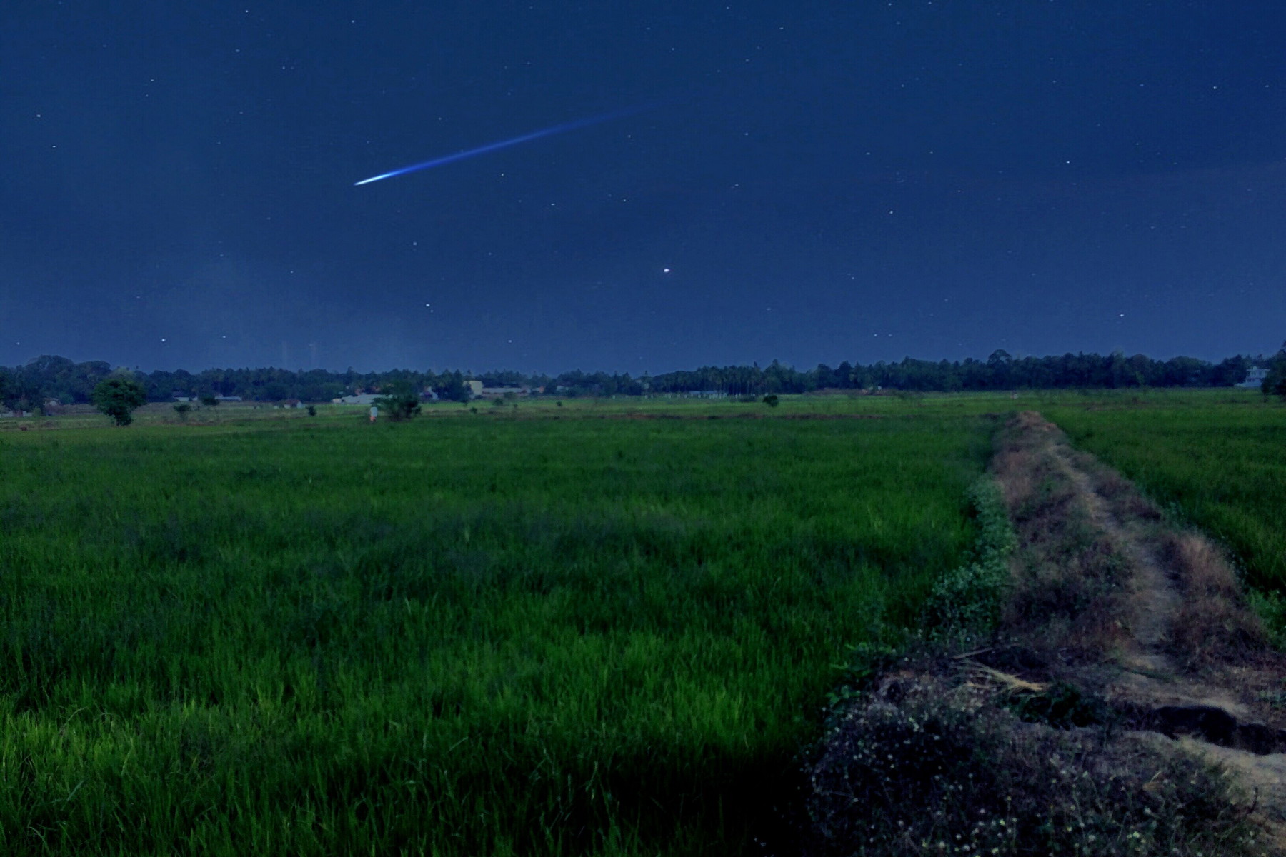 Každoročně na Zem dopadne několik tisíc meteoritů. Na snímku světelná stopa objektu křižujícího oblohu nad indickou Kéralou. (foto: Wikimedia Commons, Ramesh Kumar R, CC BY-SA 4.0)