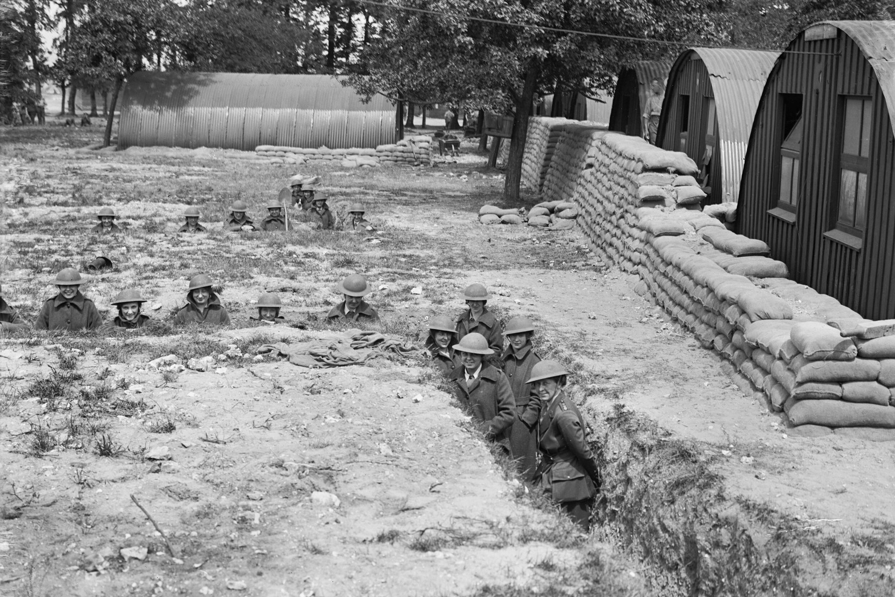 Příslušnice Queen Mary‘s Army Auxiliary Corps vedle Nissenových budek kdesi ve Francii, červen 1918. (foto: Wikimedia Commons, Imperial War Museums, IWM Non Commercial Licence)