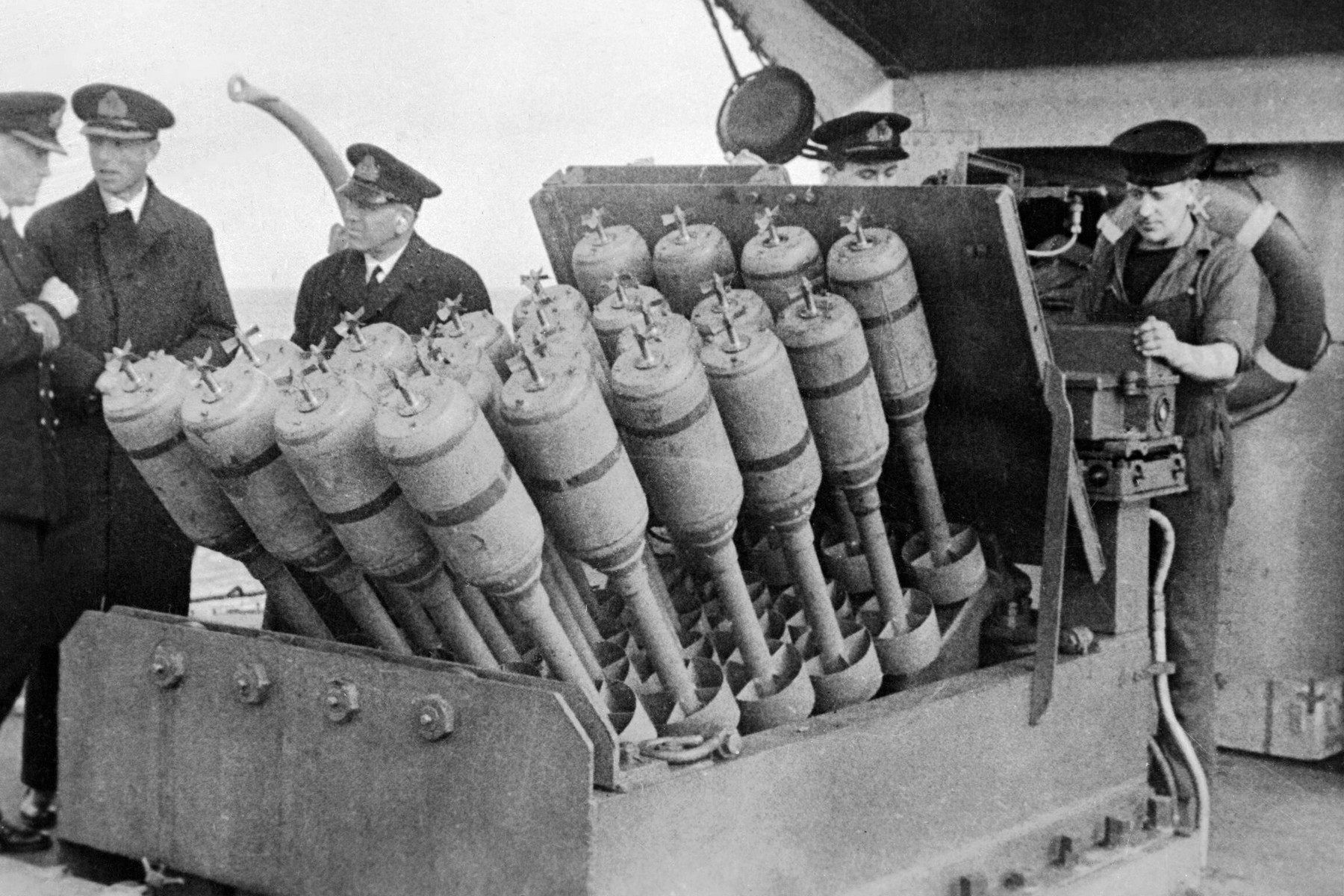 Trubkový ocas bomby se nasazoval na elektricky ovládanou tyč (spigot), která odpálila hnací nálož v základnídesce. Na snímku systém Hedgehog na přídi torpédoborce HMS Westcott. (foto: Wikimedia Commons, Imperial War Museums, IWM Non Commercial Licence)