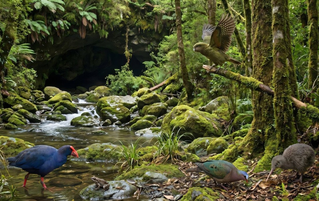 Nový výzkum jeskyně Moa Eggshell Cave na Novém Zélandu odhalil mimořádně bohatý soubor fosilií ptáků a žab, který dokumentuje podobu místního ekosystému před zhruba milionem let. (ilustrace: Canterbury Museum, Paul Scofield,CC BY-SA 4.0)