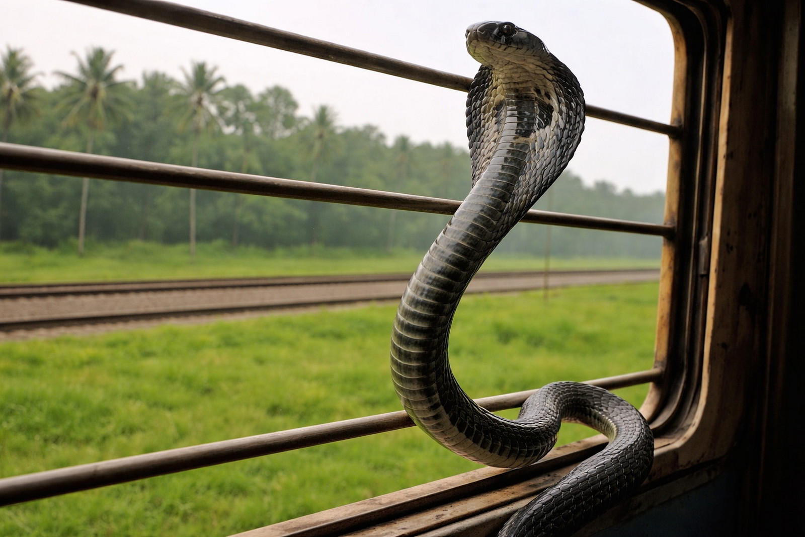 Vědci zkoumají, proč se kobry královské objevují daleko mimo své přirozené prostředí. V podezření jsou vlaky indických železnic. (ilustrace: ChatGPT, PDM 1.0)