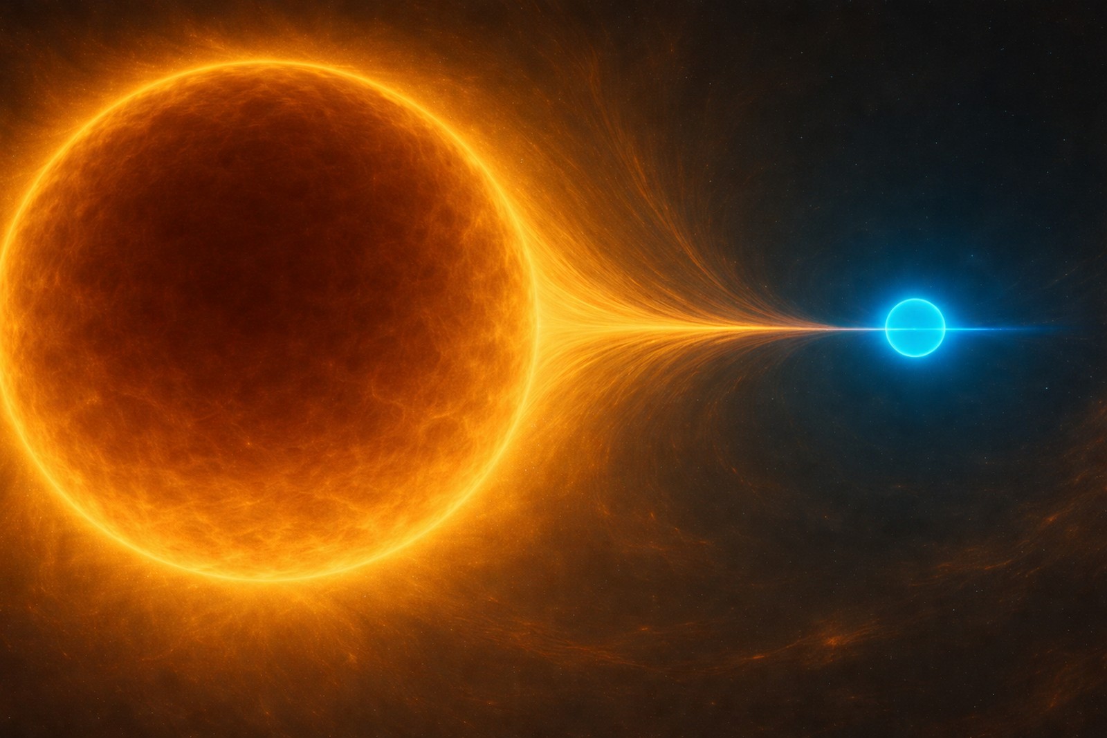 Jeden z největších známých hvězdných obrů ve Velkém Magellanově oblaku se ukázal být součástí překvapivé dvojice. K explozi v podobě supernovy zřejmě zatím nemíří. (ilustrace: ChatGPT, PDM 1.0)