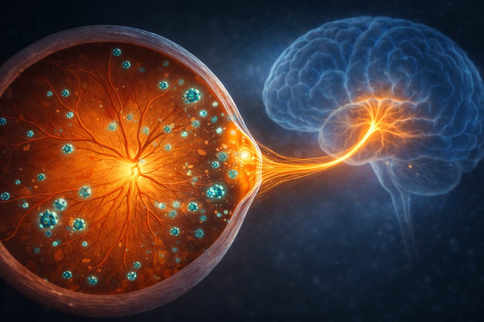 Schématická ilustrace propojení sítnice a mozku s naznačením biologických procesů, které mohou souviset s úbytkem kognitivních funkcí. (ilustrace: ChatGPT, PDM 1.0)