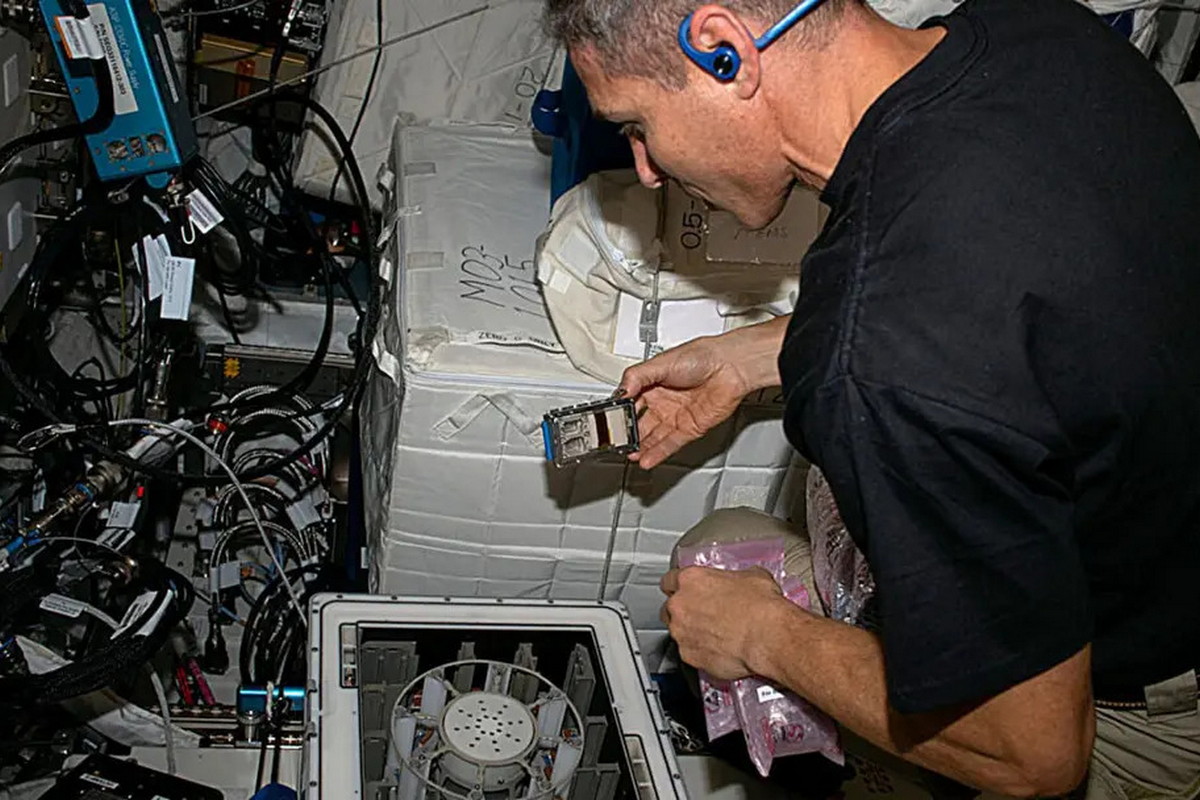 Experiment na palubě Mezinárodní vesmírné stanice ISS prověřil schopnosti mikrobů v biotěžbě. (foto: NASA/ESA/Cornell Chronicle, CC BY-SA 4.0)