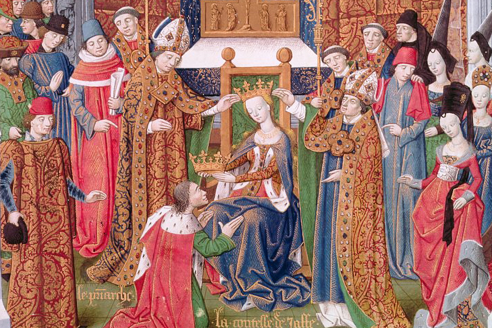 Sibyla jako nová jeruzalémská královna vkládá korunu na hlavu svého muže Guida z Lusignanu, iluminace z kroniky Viléma z Tyru z druhé poloviny 15. století. (ilustrace: Wikimedia Commons, PDM 1.0)