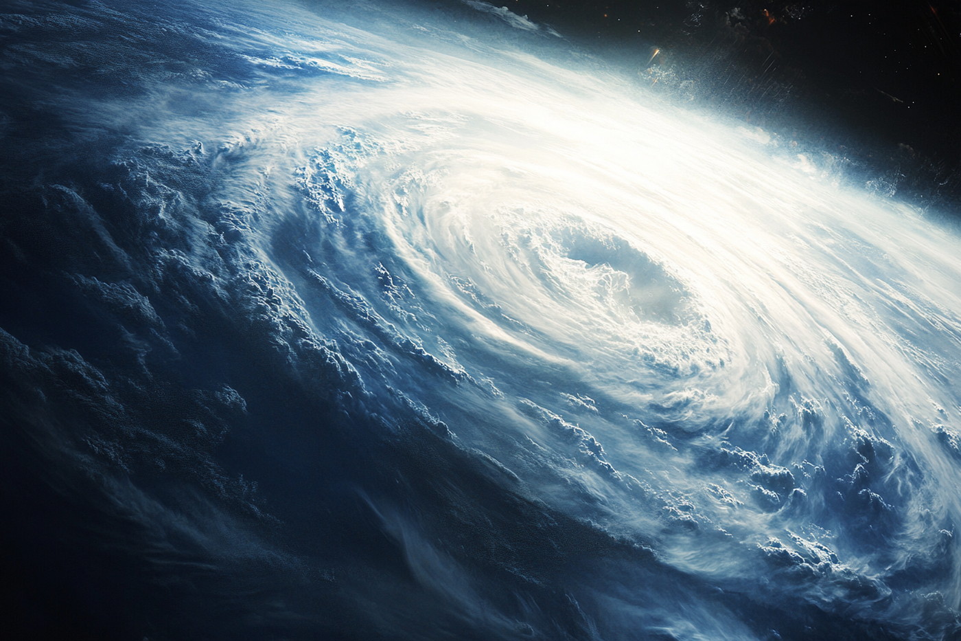 Letní bouřka představuje ve srovnání s podobnými jevy ve Sluneční soustavě nicotnou záležitost. Na Neptunu vládnou doslova supertajfuny. (ilustrace: Midjourney AI, PDM 1.0)