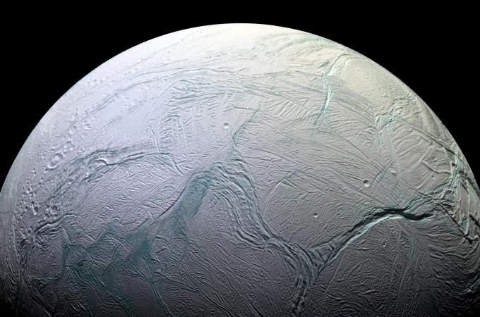 Podpovrchový oceán na Enceladu je jen pár kilometrů pod ledem
