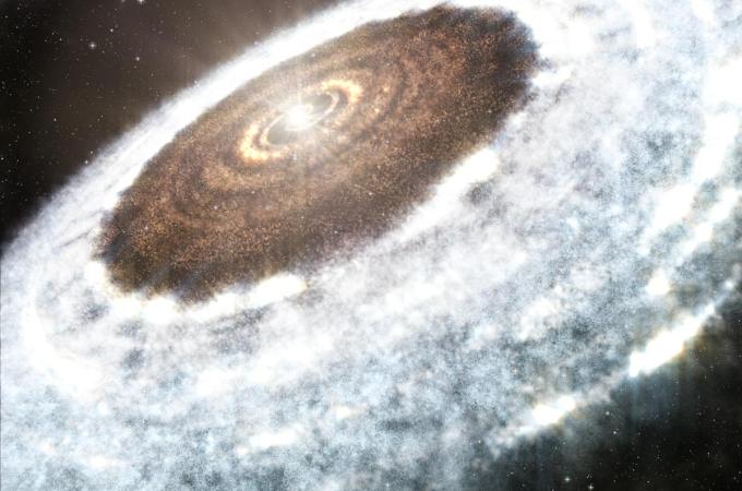 Divoké výtrysky hvězdy zviditelnily spousty ledu v protoplanetárním disku