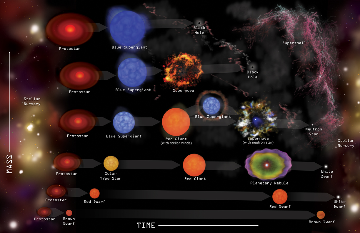 Stručný vývojový diagram zachycující hvězdy podle jejich hmotnosti.
