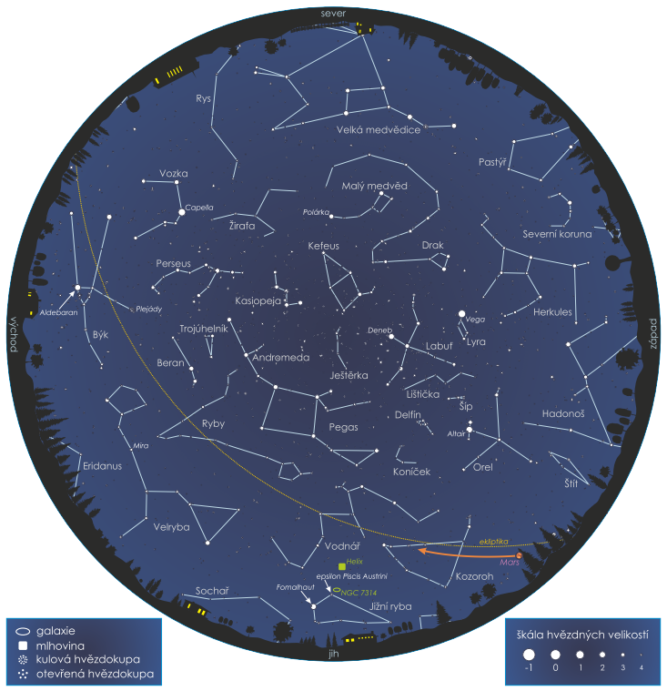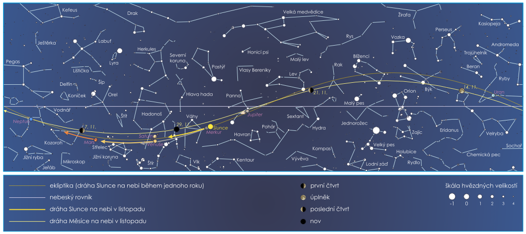 Kruhová mapa zobrazuje podobu nočního nebe 15. listopadu 2016 v 19:00 středoevropského času (SEČ). Na počátku měsíce platí pro 20:00 SEČ, na jeho konci pro 18:00 SEČ.