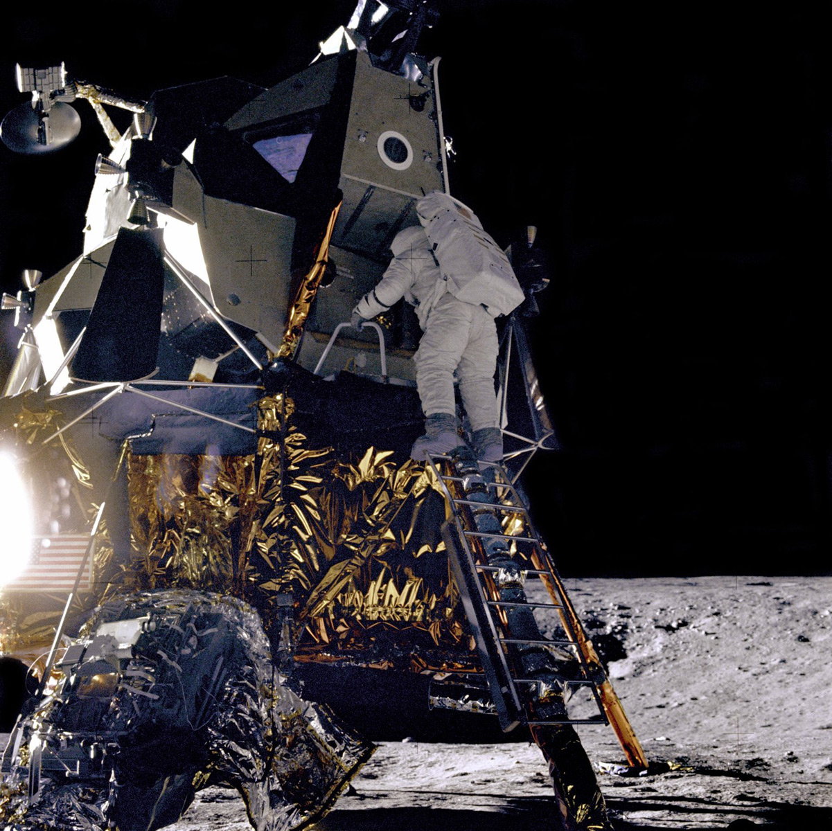 Alan Bean slézá ze žebříku lunárního modulu, aby se přidal k Peteovi Conradovi, který již postává na měsíčním povrchu. (foto: NASA, CC0)