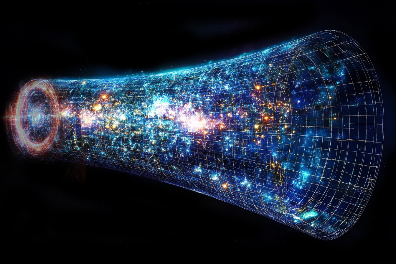 První zvuk byl zřejmě slyšet až 380 tisíc let po Velkém třesku, kdy začala vznikat hmota. (ilustrace: Midjourney AI, PDM 1.0)