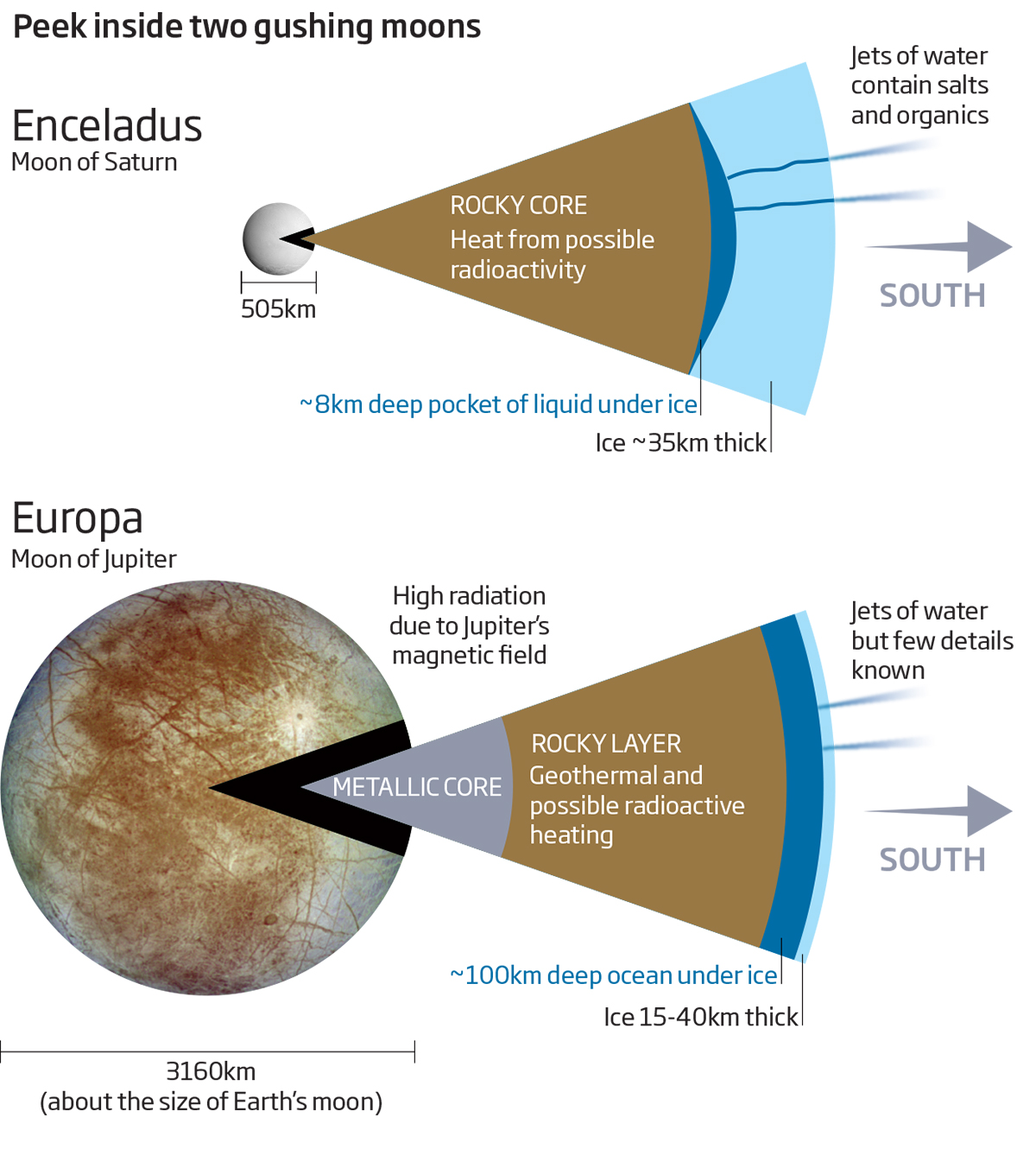 Porovnání vnitřní stavby měsíců Europa a Enceladus