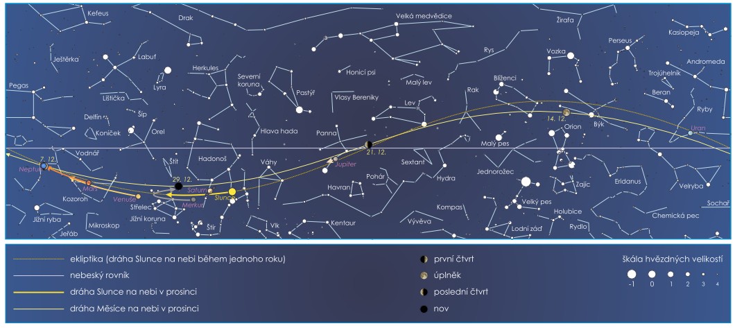 Obdélníková mapa uvádí přibližné pozice významných těles Sluneční soustavy na prosincovém nebi. U Měsíce jsou zvýrazněny pozice (včetně přesného data), ve kterých nastává první čtvrt, úplněk, poslední čtvrt a nov.