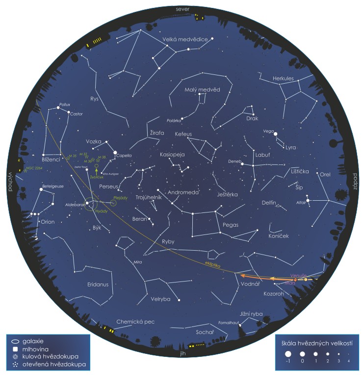 Kruhová mapa zobrazuje podobu nočního nebe 15. prosince 2016 v 19:00 středoevropského času (SEČ). Na počátku měsíce platí pro 20:00 SEČ, na jeho konci pro 18:00 SEČ.