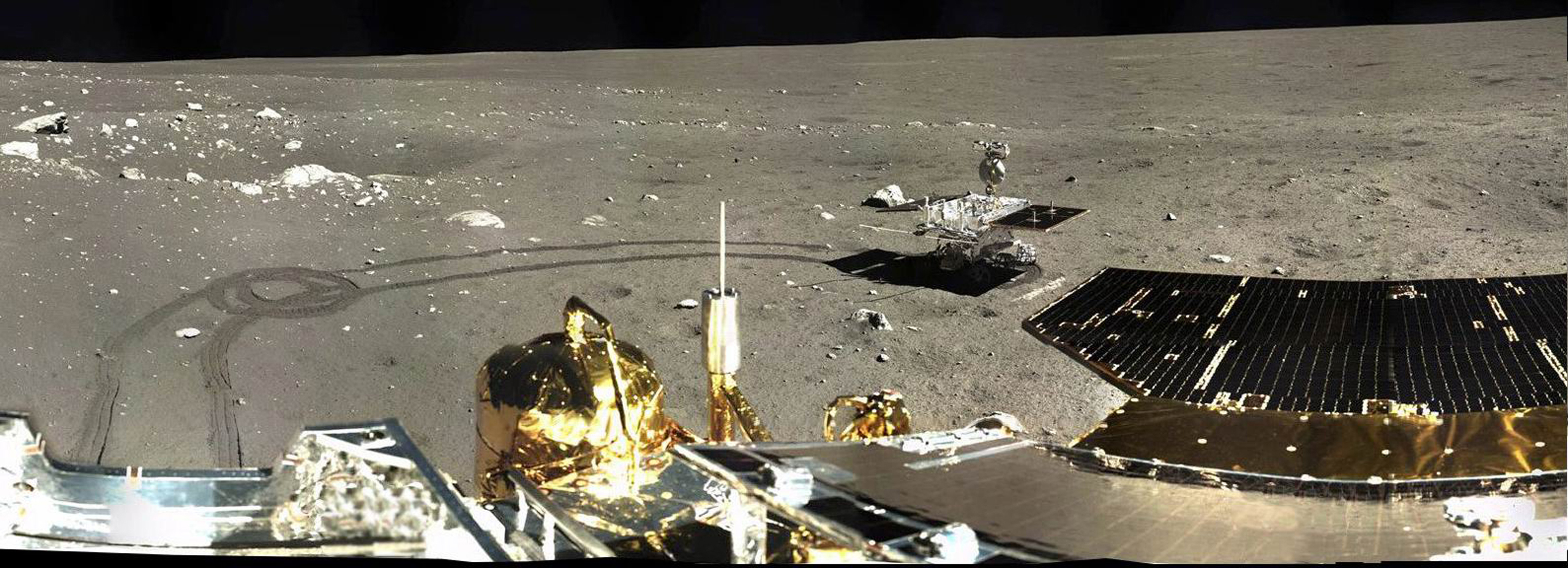 Koláž snímků zachycující první metry pohybu čínského vozítka Jutu v okolí mateřské sondy Čchang-e 3