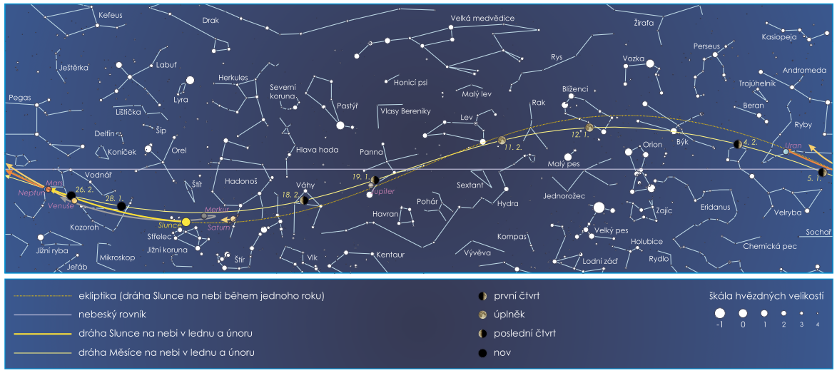 Obdélníková mapa uvádí přibližné pozice významných těles Sluneční soustavy na lednovém nebi. U Měsíce jsou zvýrazněny pozice (včetně přesného data), ve kterých nastává první čtvrt, úplněk, poslední čtvrt a nov.