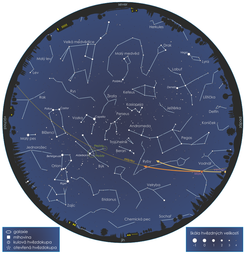Kruhová mapa zobrazuje podobu nočního nebe 15. ledna 2017 v 19:00 středoevropského času (SEČ). Na konci ledna platí pro 18:00 SEČ.