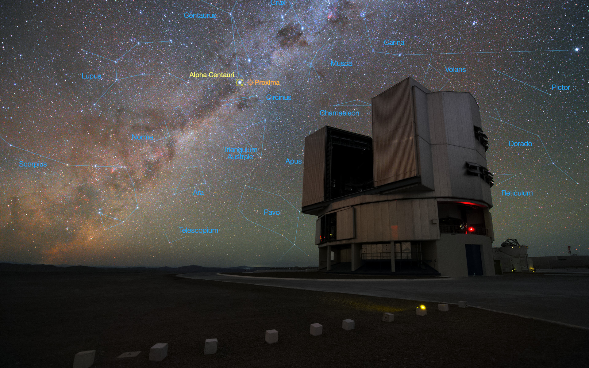 V popředí záběru je zachycen dalekohled ESO/VLT na observatoři ESO/Paranal v Chile. Bohaté hvězdné pozadí snímku obsahuje také hvězdu Alfa Centauri, která je Slunci nejbližším hvězdným systémem.