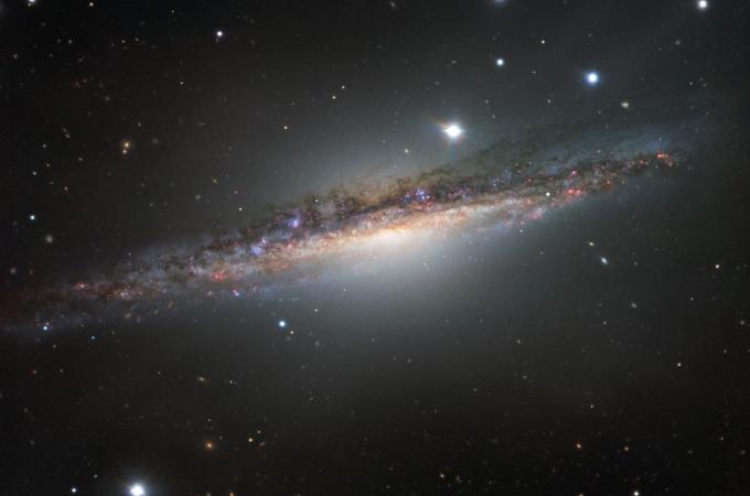 Galaxie na hraně: NGC 1055 ze souhvězdí Velryby nabízí nevšední pohled