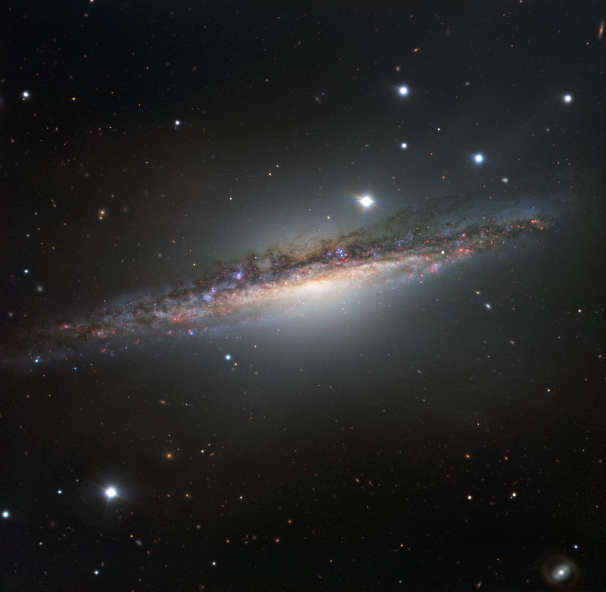 Galaxie na hraně: NGC 1055 ze souhvězdí Velryby nabízí nevšední pohled