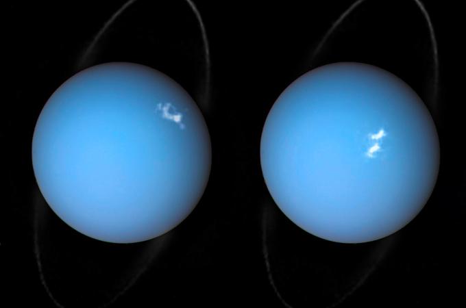 Polární záře na Uranu pohledem Hubbleova teleskopu a sondy Voyager 2