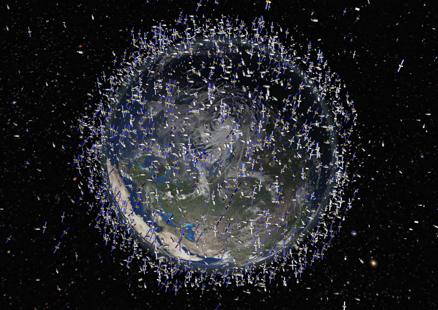 Na zemské orbitě se pohybuje přes šest tisíc funkčních satelitů, desetitisíce vysloužilých družic a statisíce nebezpečných úlomků i dalšího smetí. (ilustrace: ESA, CC BY-SA 4.0)
