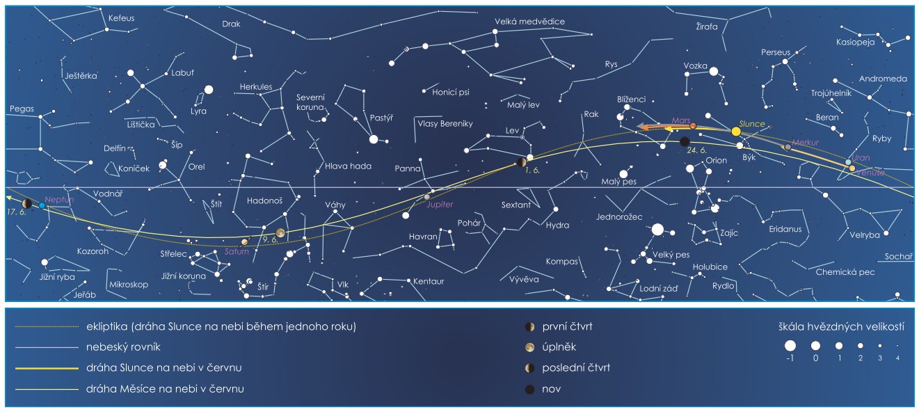 Obdélníková mapa uvádí přibližné polohy významných těles Sluneční soustavy na červnovém nebi.