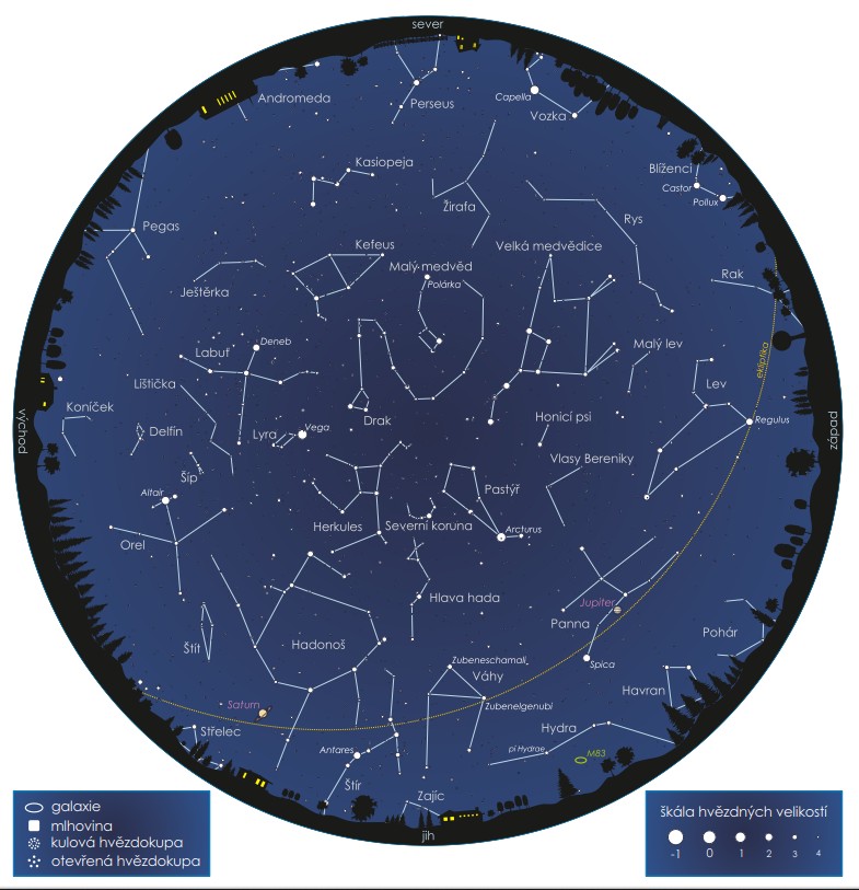 Kruhová mapa zobrazuje podobu nočního nebe 15. června 2017 ve 23:00 středoevropského letního času (SELČ). Na počátku měsíce platí pro 00:00 SELČ, na jeho konci pro 22:00 SELČ.
