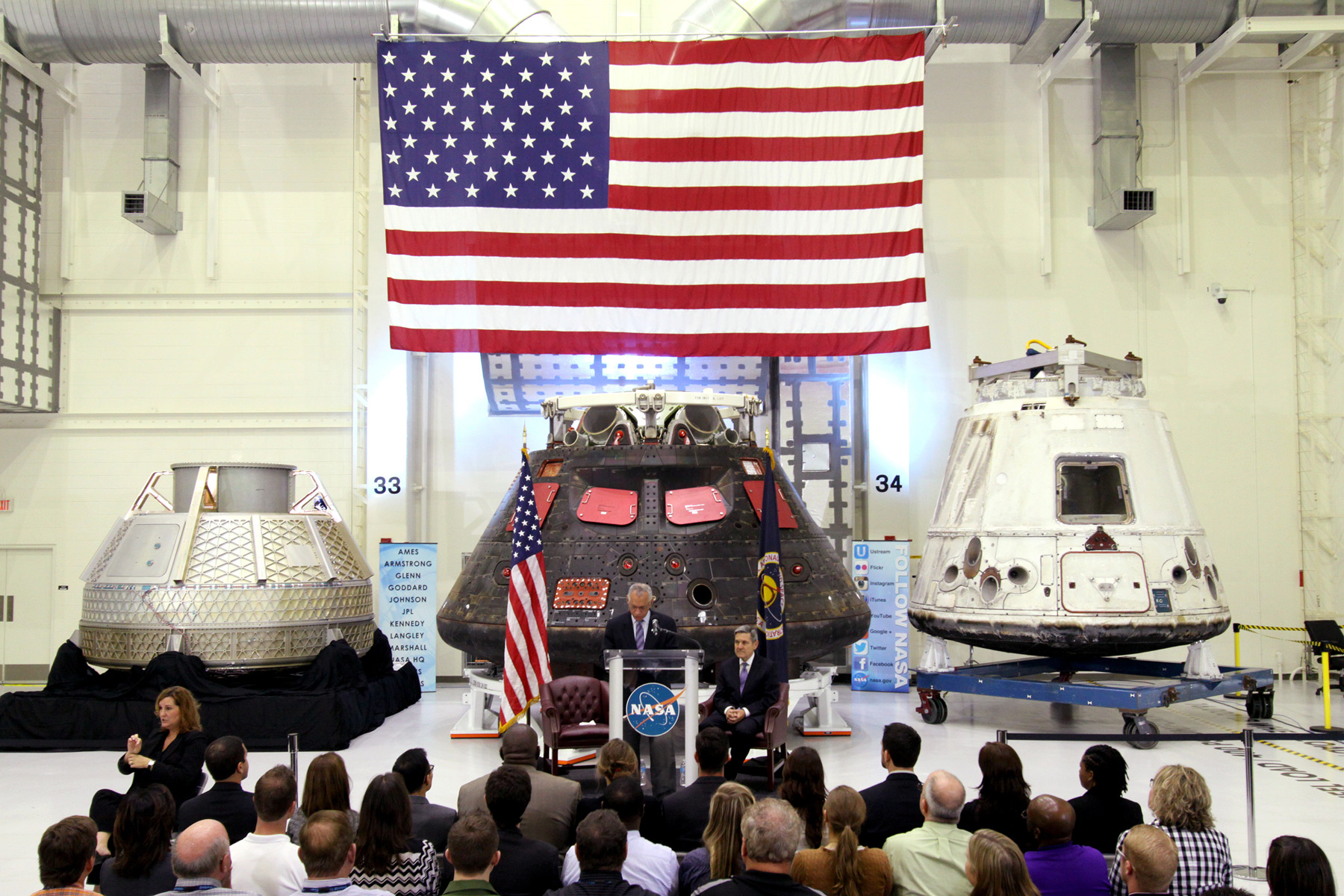 Trio nově vyvíjených amerických lodí (zleva): CST-100 Starliner (jen hermetizovaná kabina), Orion a Dragon