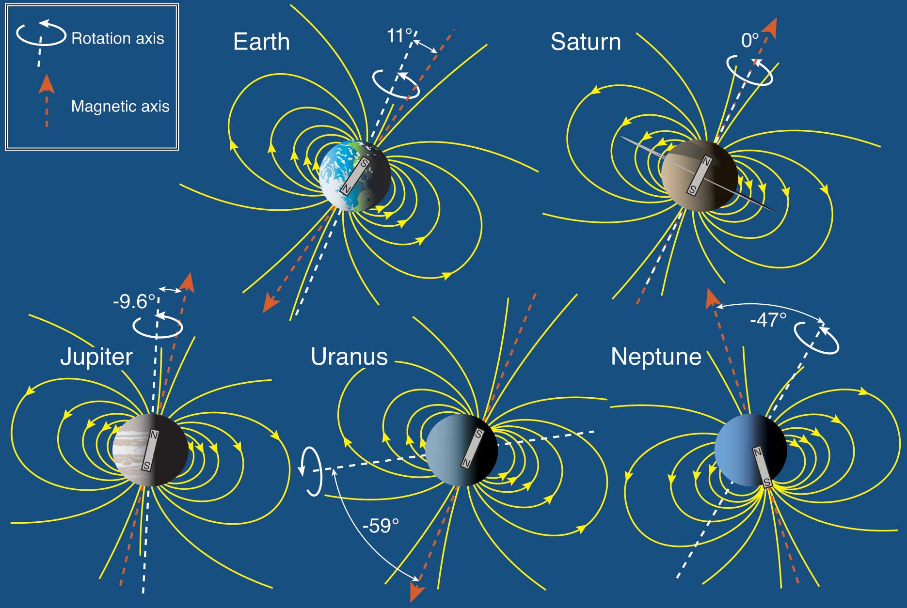 U každé planety je vyznačena osa magnetického dipólu vzhledem k rotační ose a také jeho posun, který je dobře patrný zejména v případě Uranu a Neptunu