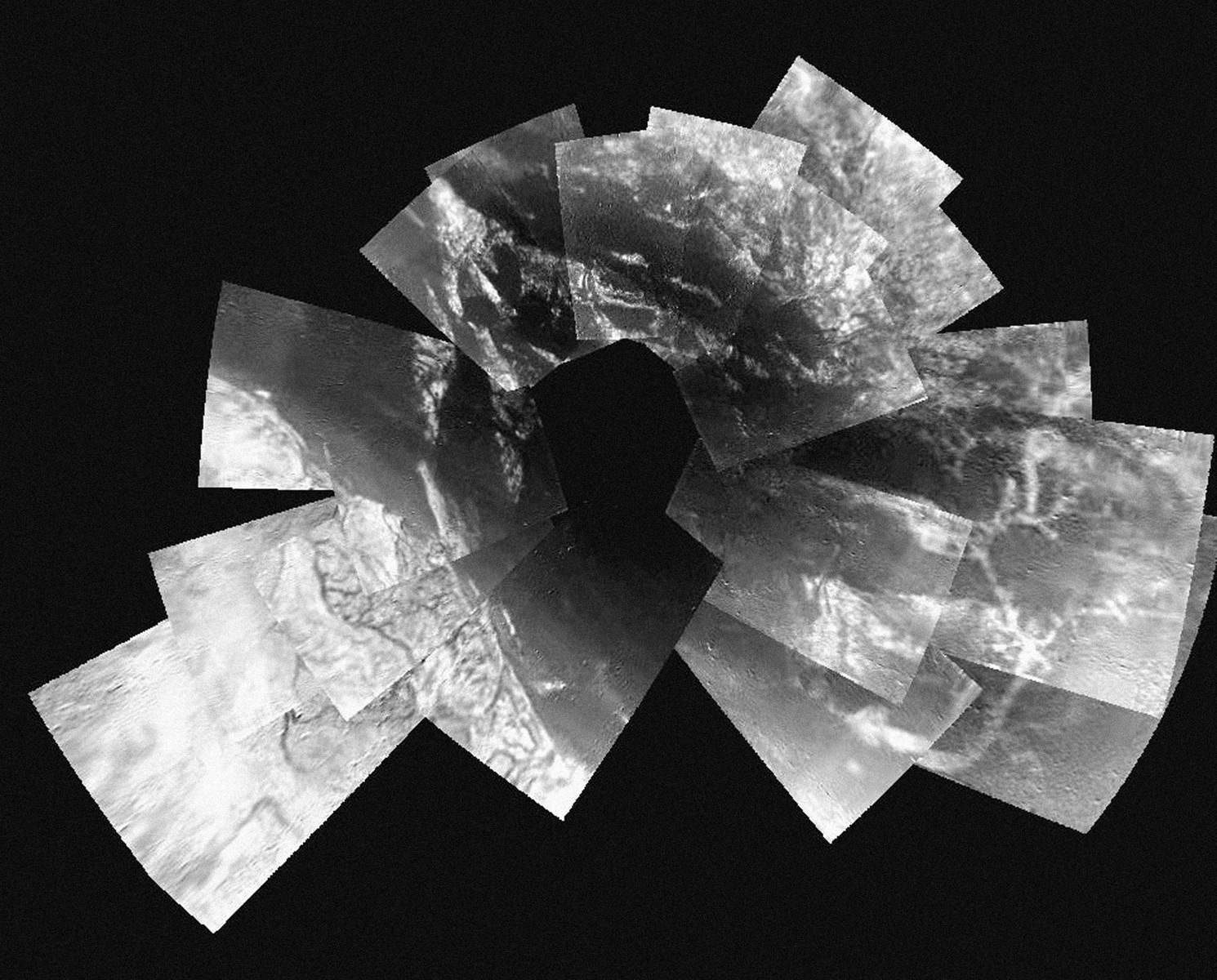 Koláž třiceti snímků pořízených ve výšce osmi kilometrů nad povrchem Titanu