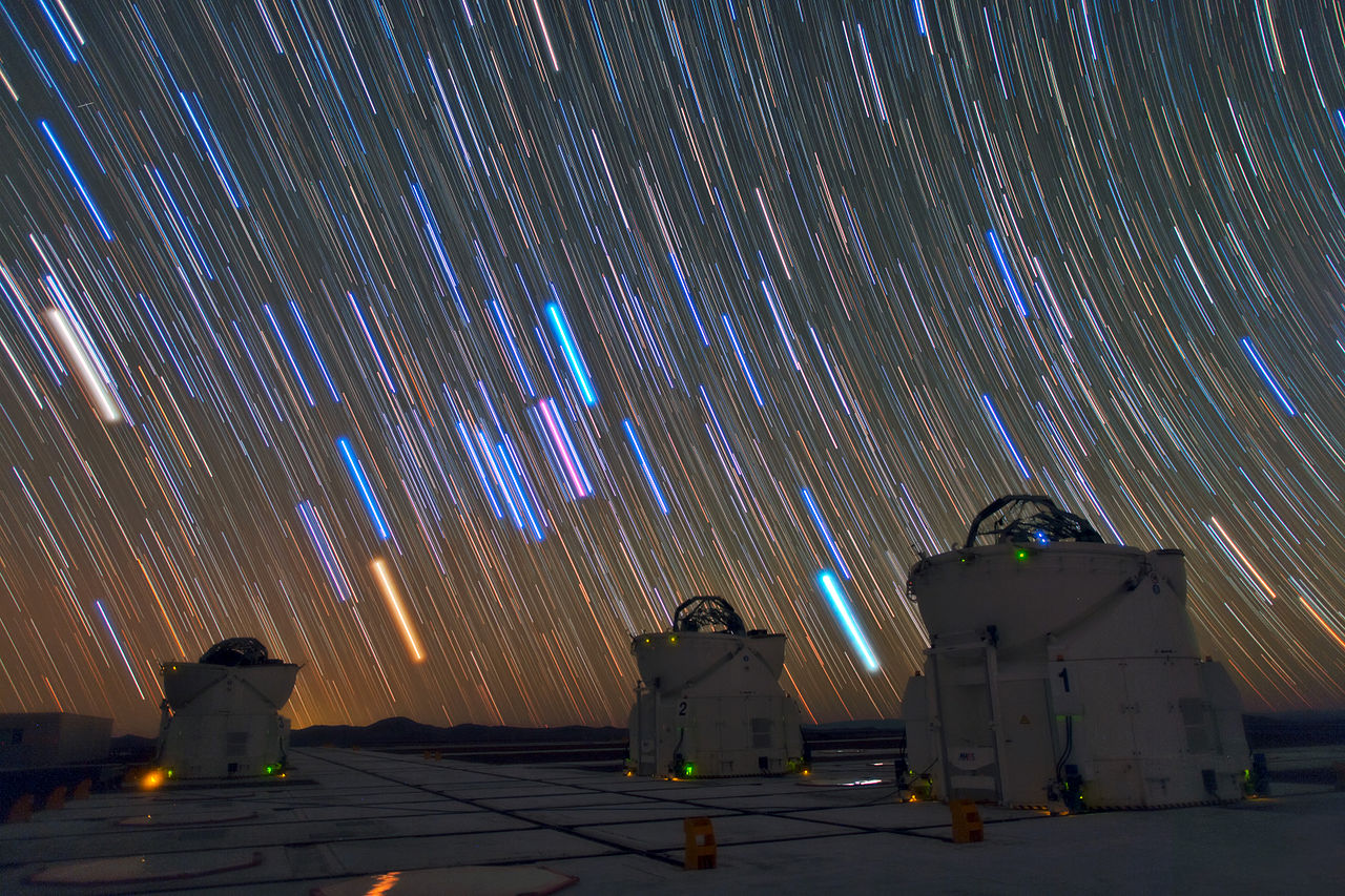 Hvězdné nebe nad vrcholem Cerro Paranal se zařízením observatoře