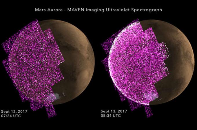 Sluneční bouře rozsvítila ohromující polární záři nad polovinou Marsu