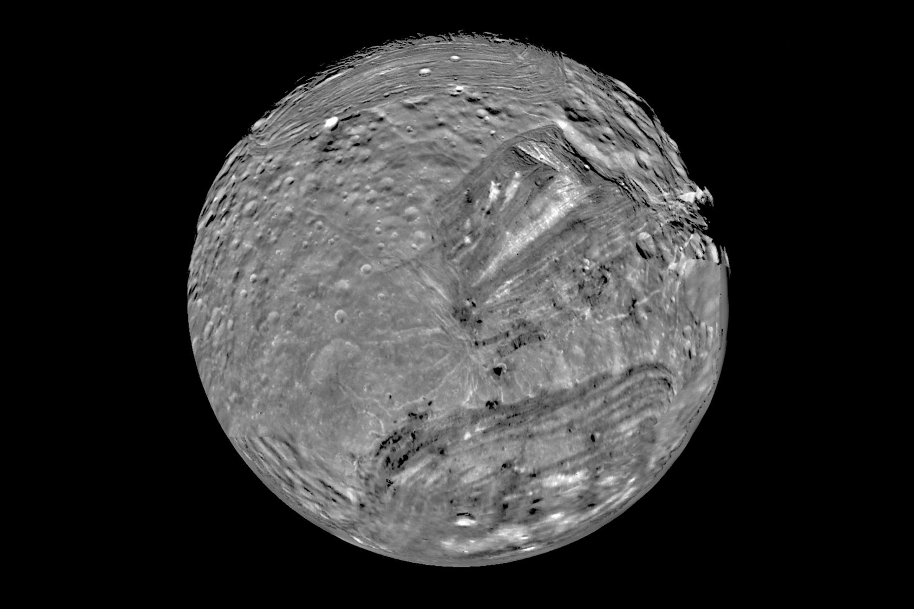 Na Mirandě se nachází obrovské kaňony, z nichž některé jsou až 12× hlubší než americký Grand kaňon, obrovské impaktní krátery i obří útesy. (foto: NASA/JPL/USGS, CC BY 4.0)